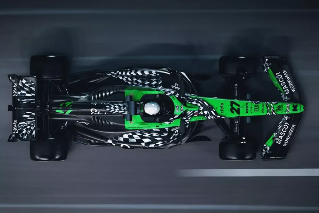 Du côté de chez Stake Sauber, la livrée verte et noire habituelle sera décorée d’un drapeau à damier parcourant presque l’entièreté de la monoplace. Ce dernier est censé représenter la fin de l’ère Sauber, avant de se tourner et de se concentrer sur le projet Audi qui débutera dès 2026. Pour rappel, dès la saison prochaine, Sauber deviendra l’écurie officielle d’Audi en Formule 1. Les monoplaces prendront les couleurs du constructeur allemand, qui a d’ailleurs récemment présenté un concept de livrée.